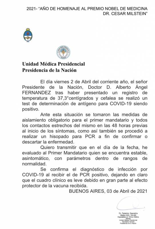 Salud | La Unidad Médica Presidencial informó que el test PCR de Alberto Fernández dio resultado positivo para coronavirus y aclaró que "el cuadro clínico" que atraviesa el primer mandatario "es leve, debido en gran parte al efecto protector de la vacuna recibida".