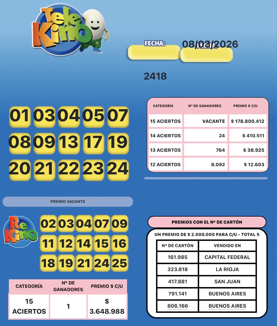 Sociedad | Este domingo, 8 de marzo, el sorteo tradicional del Telekino resultó vacante. En tanto el Rekino fue para 1 apostador.