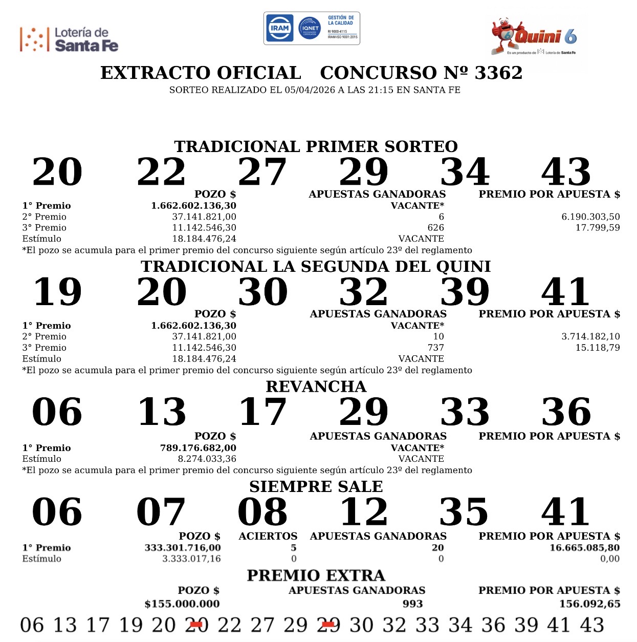 En el sorteo del Quini 6 realizado este domingo, 5 de abril, no se registraron ganadores en la modalidad Tradicional.
