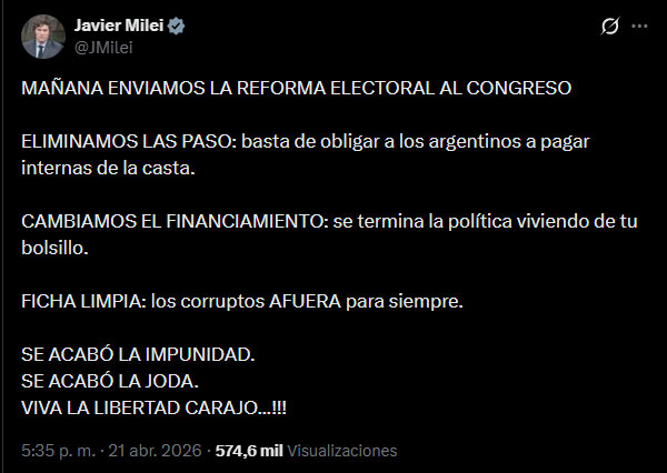 Política | El Presidente Javier Milei anunció que el Gobierno nacional avanzará con una reforma electoral que será enviada al Congreso este miércoles 22 de abril. La iniciativa comentada por el presidente contempla cambios de fondo en el sistema político actual, especialmente las PASO -una propuesta de campaña de Milei-.
